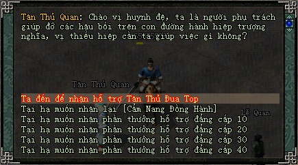 Quý nhân sỹ có thể đến gặp Tân thủ quan tại 8 tân thủ thôn để tiến hành nhận thưởng, mỗi mốc đẳng cấp, người chơi chỉ có thể nhận một lần duy nhất